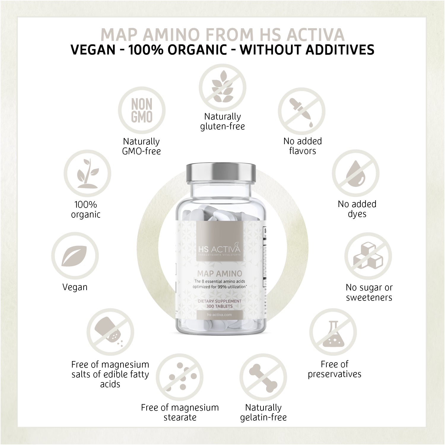 Der menschliche Körper benötigt zahlreiche Aminosäuren, die entsprechen als essentiell beschrieben werden. Gerade körperlich sportliche Personen sollten den Körper ausreichend mit diesen Aminosäuren versorgen. Mit MAP ist das relativ einfach möglich. MAP ist ein Kombinationspräparat, welches aus acht essentiellen Aminosäuren pflanzlicher, GMO-freier Herkunft besteht.